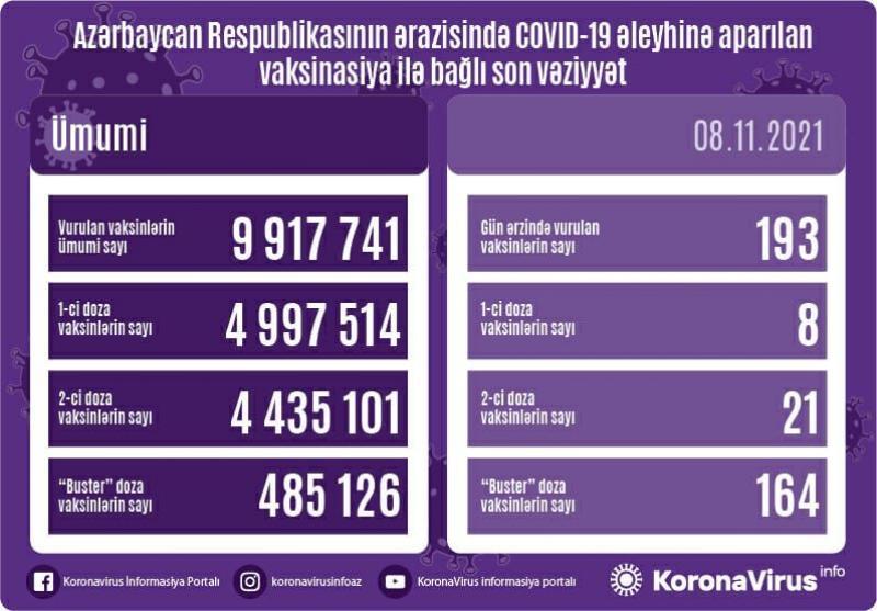 Nazirlər Kabineti yanında Operativ Qərargahdan verilən məlumata görə, bir gündə birinci mərhələ üzrə vaksinasiya olunanların sayı 8, ikinci mərhələ üzrə vaksinasiya olunanların sayı 21, "buster" doza üzrə vaksinasiya olunanların sayı isə 164 nəfərdir.