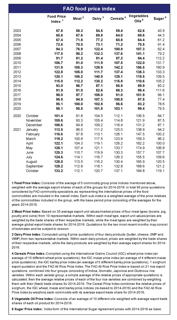 Bitki yağının qiymətləri oktyabr ayında təxminən 10 faiz artımla rekord səviyyəyə çatıb, taxılın qiyməti isə əvvəlki ilə nisbətən 22%-dən çox artım nümayiş etdirib. 2021-ci ilin 10 ayı ərzində bitki yağlarının qiymət indeksi 86% artaraq 184,8 bəndə çatıb. İşçi qüvvəsinin çatışmazlığı da bütün dünyada ərzaq istehsalı və daşınması xərclərinin artmasına səbəb olub. Buğdanın qiyməti Kanada, Rusiya və ABŞ kimi əsas ixracatçıların zəif məhsuldarlıq dövrü keçirməsi ilə əlaqədar olaraq son 12 ayda demək olar ki, 40 faiz artıb. Süd məhsullarının maya dəyəri də ötən il daşınmada yaranan problemlər səbəbindən təxminən 16 faiz bahalaşıb.