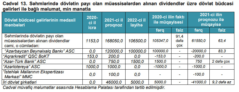 “Qeyd etmək lazımdır ki, 2021-ci ildə iri dövlət şirkətlərindən alınacaq dividendlər 5 şirkət (ARDNŞ, “Azərbaycan Dəmir Yolları” QSC, “Azərişıq” ASC, “Azərbaycan Xəzər Dəniz Gəmiçiliyi” QSC, “Azərenerji” ASC) üzrə nəzərdə tutulduğu halda, cari ilin 8 ayında bu mənbədən dövlət büdcəsinə vəsait daxil olmamış, 2022-ci ilin büdcə layihəsində yalnız "Azərbaycan Dövlət Xəzər Dəniz Gəmiçiliyi" QSC üzrə 5 milyon min manat nəzərdə tutulmuşdur.