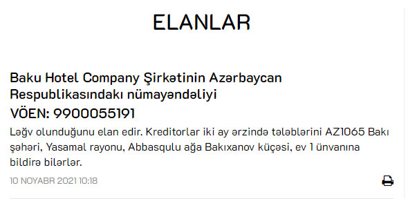 "Baku Hotel Company" Şirkətinin Azərbaycan Respublikasındakı nümayəndəliyi ləğv edilir. Qeyd edək ki, "Baku Hotel Company" "Hyatt Regency Baku" mehmanxanasını idarə edən şirkət kimi tanınır.