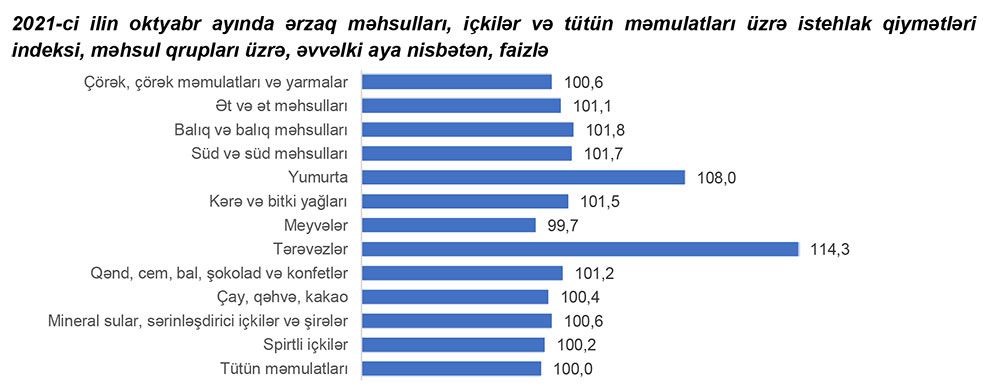2021-ci ilin oktyabr ayında ərzaq məhsulları, içkilər və tütün məmulatları üzrə istehlak qiymətləri indeksi əvvəlki aya nisbətən 102,8 faiz, əvvəlki ilin oktyabr ayına nisbətən 113,1 faiz təşkil etmişdir.