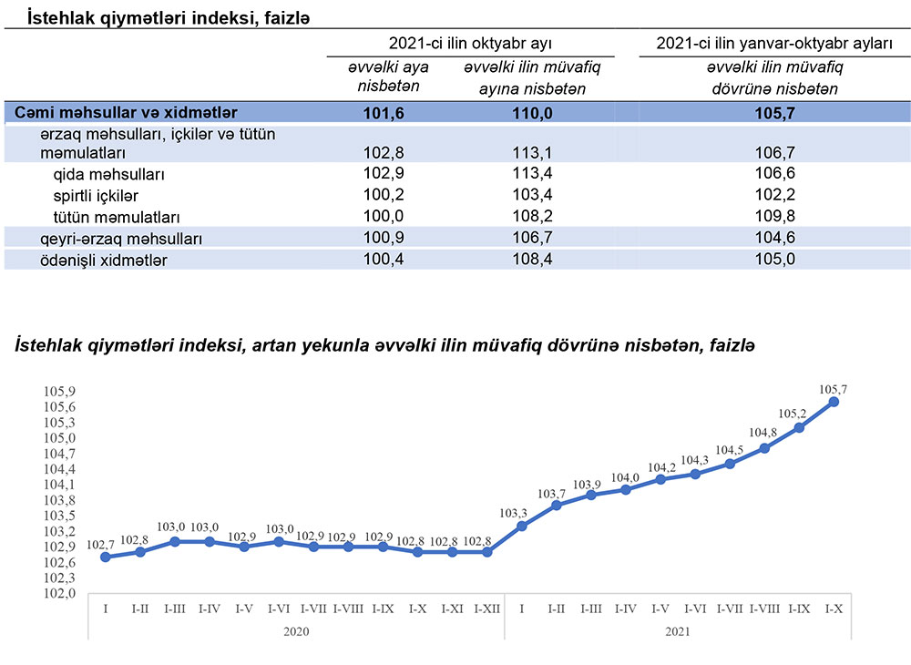 Azərbaycanda 10 aylıq inflyasiya 5,2%-dən 5,7%-ə yüksəlib. Oktyabr ayında isə illik inflyasiya 10% təşkil edib (Qiymətlər ötən ilin oktyabr ayı ilə müqayisədə 10% artıb). Ərzaq məhsulları, içkilər və tütün məmulatları üzrə qiymətlər əvvəlki ilin oktyabr ayına nisbətən 13,1 faiz artıb.2021-ci ilin yanvar-oktyabr aylarında istehlak qiymətləri indeksi (inflyasiya göstəricisi) 2020-ci ilin yanvar-oktyabr aylarına nisbətən 105,7 faiz, o cümlədən ərzaq məhsulları, içkilər və tütün məmulatları üzrə 106,7 faiz, qeyri-ərzaq məhsulları üzrə 104,6 faiz, əhaliyə göstərilmiş ödənişli xidmətlər üzrə 105,0 faiz təşkil etmişdir. Cari ilin oktyabr ayında istehlak qiymətləri indeksi əvvəlki aya nisbətən 101,6 faiz, əvvəlki ilin oktyabr ayına nisbətən 110,0 faiz təşkil etmişdir.