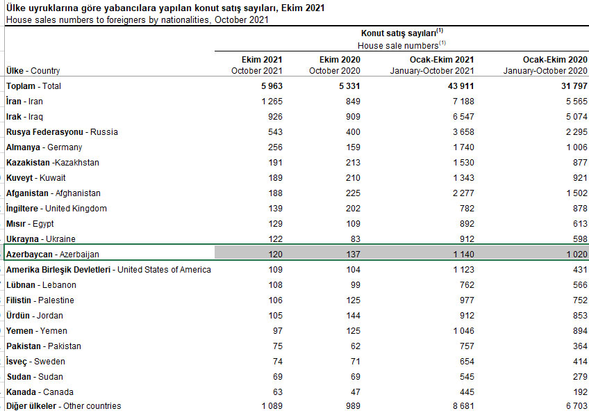 2021-ci ilin yanvar-oktyabr aylarında (10 ay ərzində) azərbaycanlılar Türkiyədə 1140 mənzil alıblar. 2020-cu ilin eyni dövründə azərbaycanlılar Türkiyədə 1020 mənzil almışdılar. Təkcə Oktyabrda azərbaycanlılar tərəfindən 120 mənzil alınıb.