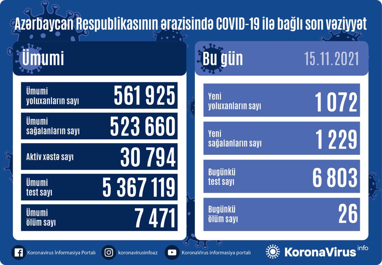 Azərbaycanda koronavirus (COVID-19) infeksiyasına yeni 1072 yoluxma faktı qeydə alınıb, 1229 nəfər müalicə olunaraq sağalıb.