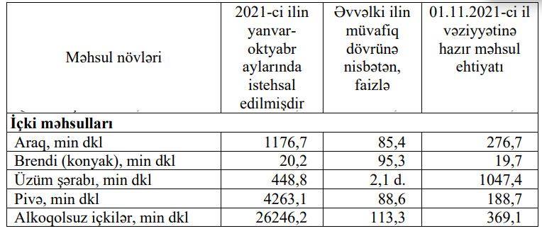 Əvvəlki ilin müvafiq dövrünə nisbətən pivə istehsalı 11,4% azalaraq 4 milyon 263,1 min dekalitrə, araq istehsalı 14,6% azalaraq 1 milyon 176,7 min dekalitrə, brendi (konyak) istehsalı isə 4,7% azalaraq 20,2 min dekalitrə düşüb.