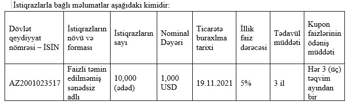 Marja Birjanın yaydığı məlumata istinadən xəbər verir ki, hərracda hər birinin nominal dəyəri 1000 dollar olan 10 min ədəd faizli təmin edilməmiş sənədsiz adlı istiqraz təklif ediləcəkdir. Tədavül müddəti 3 il, kupon faizlərinin ödəniş müddəti - hər 3 təqvim ayından bir nəzərəd tutulur.