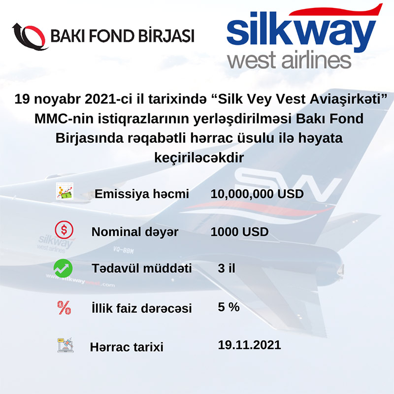 19 noyabr 2021-ci il tarixində “Silk Vey Vest Aviaşirkəti” MMC-nin istiqrazlarının yerləşdirilməsi Bakı Fond Birjasında rəqabətli hərrac üsulu ilə həyata keçiriləcəkdir.