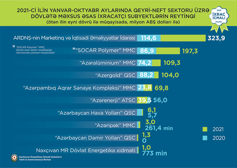 2021-ci ilin yanvar-oktyabr ayları üzrə hazırlanan qeyri-dövlət ixracatçı subyektlərin reytinqində ilk onluqda aşağıdakı şirkətlər təmsil olunurlar: “MKT İstehsalat Kommersiya” MMC, “Azərbaycan İnterneyşnl Mayninq Kompani Limited Şirkəti”nin Azərbaycan Respublikasındakı Nümayəndəliyi, “Local Garden” Məhdud Məsuliyyətli Cəmiyyəti, “Baku Steel Company” MMC, “Sun Food” MMC, “P-Aqro” MMC, Hidayətov Təyyar Hidayət oğlu, “Azərbaycan Şəkər İstehsalat Birliyi” MMC, “RAM Beynəlxalq Nəqliyyat və Ticarət LTD” MMC, “Bulder 007 LTD” MMC.