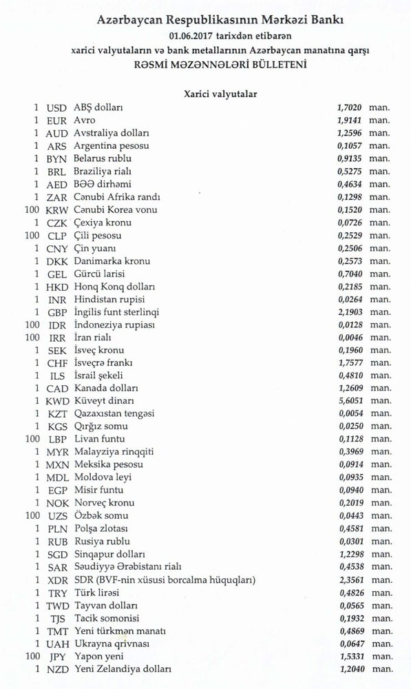 İyunun 1-nə Mərkəzi Bankın açıqladığı rəsmi Dollar/manat məzənnəsi Mayın 31-i ilə müqayisədə dəyişməyərək 1,7020 manat olub, Avro/manat məzənnəsi isə 1.9141 manata qalxıb.