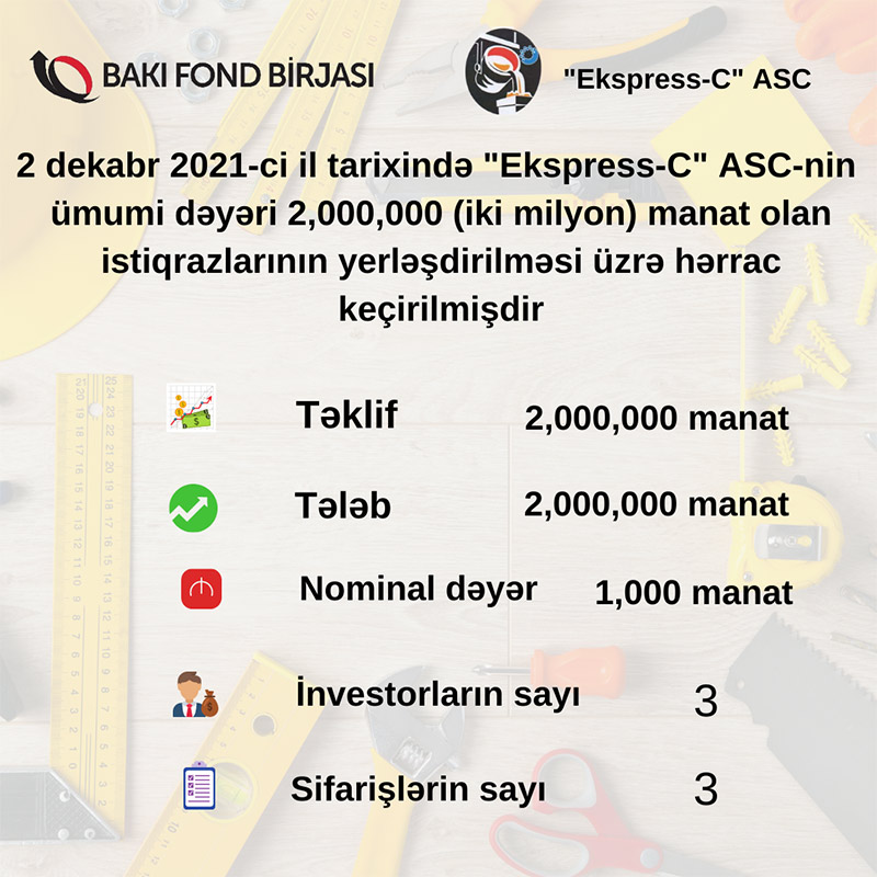 2 dekabr 2021-ci il tarixində Bakı Fond Birjasında "Ekspress-C" ASC-nin tədavül müddəti 2 (iki) təqvim ili olan AZ2001023608 dövlət qeydiyyat nömrəli, 2 milyon manat həcmində, faizli, təmin edilməmiş sənədsiz, adlı istiqrazlarının yerləşdirilməsi üzrə hərrac yekunlaşıb.