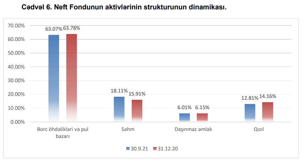 Rəydə qeyd edilib ki, 2021-ci ilin 9 ayı üzrə Dövlət Neft Fondunun vəsaitlərinin idarə edilməsindən 1 milyard 333,1 milyon ABŞ dolları və ya 2 milyard 266,3 milyon manat məbləğində gəlir əldə etmişdir. Fondun 2021-ci il üzrə qəbul edilmiş investisiya siyasətinə əsasən investisiya portfelinin minimum 50 faizi borc öhdəlikləri və pul bazarları alətlərindən, 25 faizə qədəri səhmlərdən (pay), 10 faizə qədəri daşınmaz əmlakdan və 15 faizə qədəri isə qızıl alt portfellərindən ibarət olmuşdur.