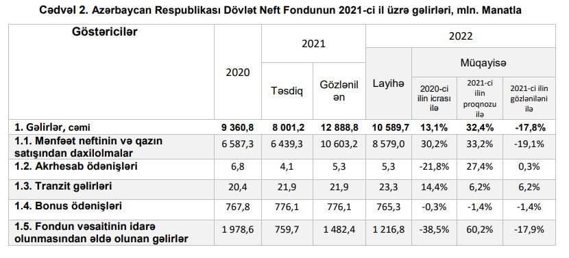 Fondun büdcə gəlirləri 10 milyard 589,7 miylon manat həcmində proqnozlaşdırılmışdır ki, bu da 2020-ci ilin müvafiq icra göstəricisindən 1 milyard 228,9 milyon manat və ya 13,1%, 2021-ci ilin proqnozundan isə 2 milyard 588,5 milyon manat və ya 32,4% çox, 2021-ci ilin gözlənilən icra göstəricisindən 2 milyard 299,1 milyon manat və ya 17,8% azdır. 2022-ci il üçün Fondun büdcəsinin baza göstəricisi olan 1 barel neftin orta illik ixrac qiyməti növbəti il üçün 50,0 ABŞ dolları, Azərbaycan manatının ABŞ dollarına qarşı orta illik məzənnəsi dövlət büdcəsi ilə eyni səviyyəsində götürülmüşdür. Bu göstəricilərə 7 uyğun olaraq Dövlət Neft Fondunun 2022-ci il üzrə büdcə gəlirlərinin ümumi həcmi 6 milyard 229,2 milyon ABŞ dolları və yaxud 10 milyard 589 milyon 701,9 min manat olması proqnozlaşdırılır ki, bu da manat ifadəsi ilə 2021-ci ilin gözlənilən icra göstəricisindən 2 milyard 299,1 milyon manat və ya 17,8% azdır.