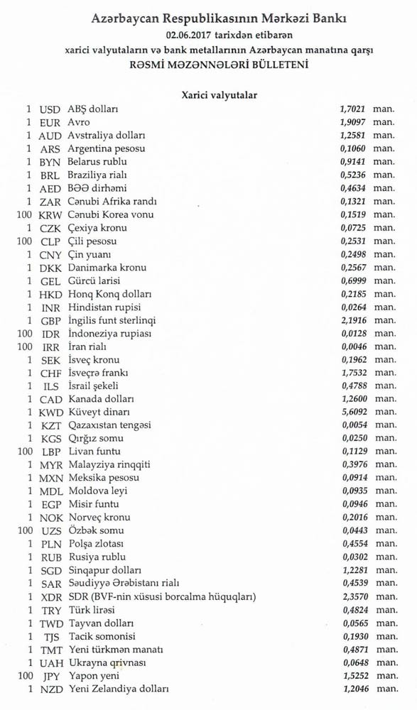İyunun 2-nə Mərkəzi Bankın açıqladığı rəsmi Dollar/manat məzənnəsi İyunun 1-i ilə müqayisədə qalxaraq 1,7021 manat olub, Avro/manat məzənnəsi isə 1.9097 manata düşüb .