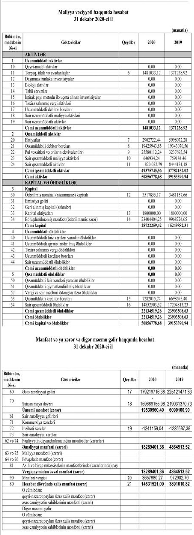 Satışın maya dəyəri isə 2020-ci ildə 2019-cu illə müqayisədə 59 milyon 342 min 215 manat və ya 27% azalaraq 219 milyon 31 min 371 manatdan 159 milyon 689 min 156 manata geriləyib.