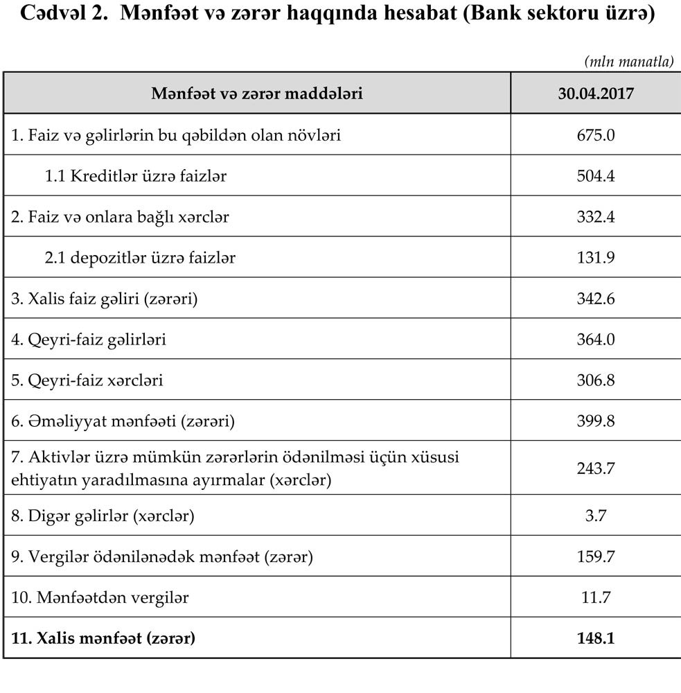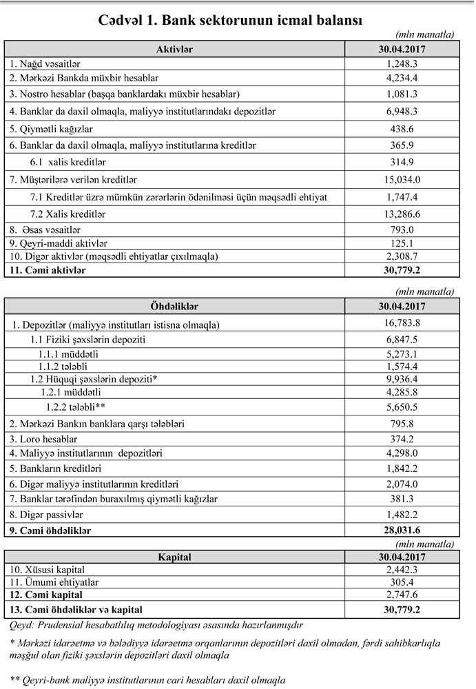 2017-ci ilin 30 aprel tarixinə olan bank sektorunun əsas göstəriciləri bank sektorunun icmal göstəricilərində öz əksini tapmışdır.