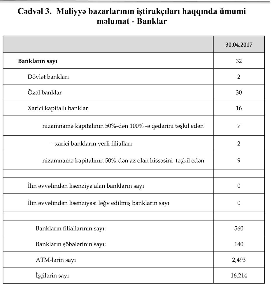 Azərbaycanda fəaliyyət göstərən 32 bankın 30 aprel 2017-ci il tarixinə cəmi aktivləri 30 milyard 779.2 milyon manat, cəmi öhdəlikləri 28 milyard 31.6 milyon manat təşkil etmişdir.