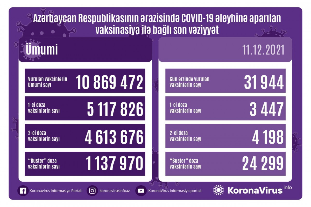 Bir gündə birinci mərhələ üzrə vaksinasiya olunanların sayı 3 447, ikinci mərhələ üzrə vaksinasiya olunanların sayı 4 198, buster doza üzrə vaksinasiya olunanların sayı isə 24 299 nəfərdir.