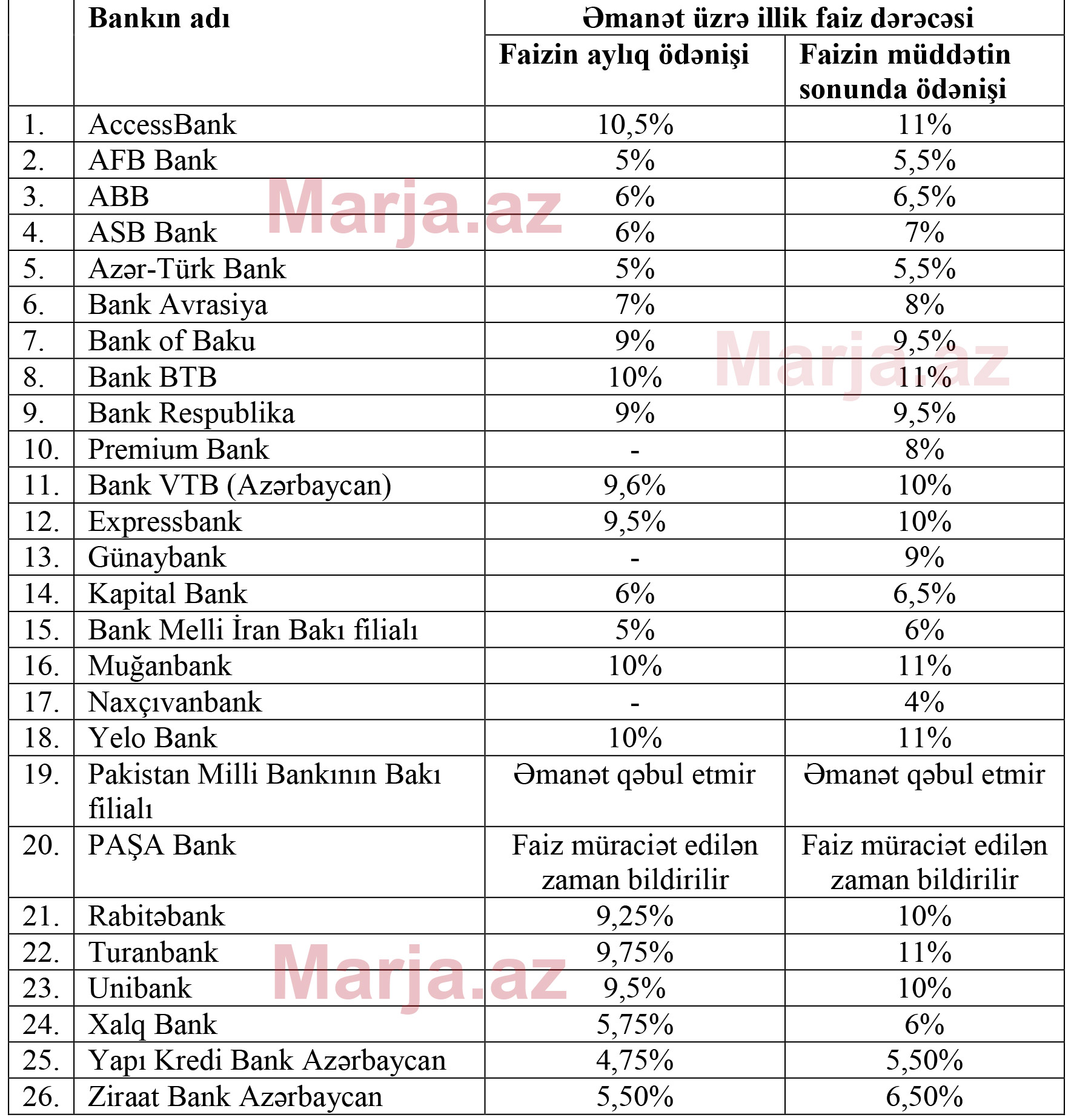 “Marja.az” araşdırmasına əsasən, hazırda 12 ay müddəti üzrə ən yüksək əmanət faizlərini AccessBank, Bank BTB, Muğanbank, Turanbank, Yelo Bank, Bank VTB Azərbaycan, Expressbank, Rabitəbank və Unibank təklif edir.