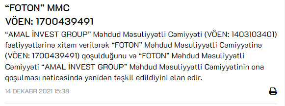 Marja.az xəbər verir ki, “Foton” MMC, “Amal İnvest Group” MMC-nin ona qoşulması nəticəsində yenidən təşkil edildiyini elan edib.