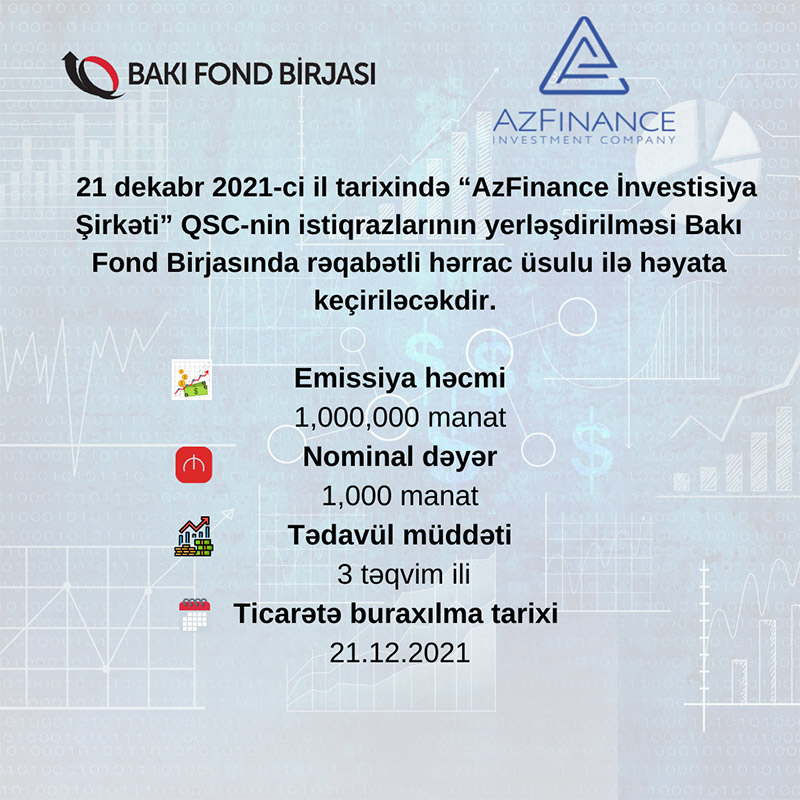 Birjanın yaydığı məlumata görə, 21 dekabr 2021-ci il tarixində “AzFinance İnvestisiya Şirkəti” QSC-nin istiqrazlarının yerləşdirilməsi Bakı Fond Birjasında rəqabətli hərrac üsulu ilə həyata keçiriləcəkdir.