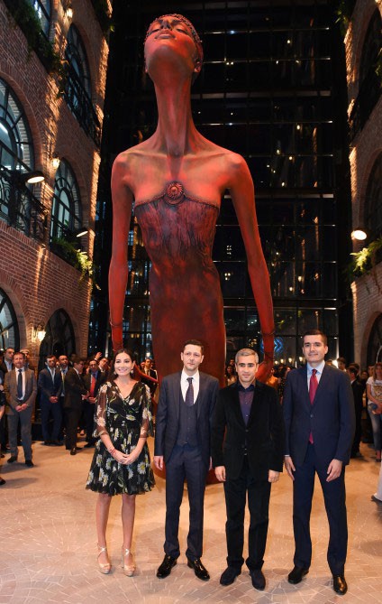 Bakı Media Mərkəzinin prezidenti Arzu Əliyeva və rəssam Rəşad Mehdiyev əsərin üzərindəki ağ örtüyü götürdülər.