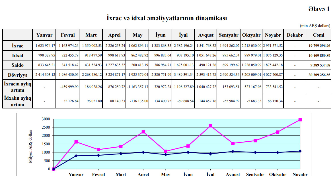 Müqayisə üçün qeyd edək ki, 2020-ci ilin 11 ayında Azərbaycanın xarici ticarət əməliyyatlarının həcmi 22 milyard 746 milyon 64 min ABŞ dolları, o cümlədən ixrac 13 milyard 60 milyon 548 min ABŞ dolları, idxal 9 milyard 685 milyon 516 min ABŞ dolları, saldo 3 milyard 375 milyon 32 min ABŞ dolları təşkil etmişdi.