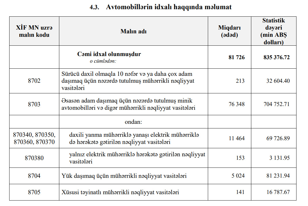 2021-ci ilin yanvar-noyabr ayları ərzində (11 ayda) xarici ölkələrdən Azərbaycana 835 milyon 377 min dollar dəyərində 81 min 726 ədəd avtomobil (nəqliyyat vasitələri) idxal edilib.
