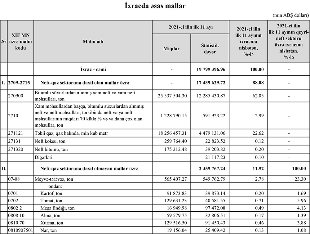 Bu ilin yanvar-noyabr dövründə neft-qaz sektoruna daxil olan mallar üzrə ixracın cəmi məbləği 17 milyard 439 miylon 630 min ABŞ dolları təşkil edib (ötən ilin eyni dövründə 11 milyard 422 miylon 377 min dollar təşkil etmişdi).