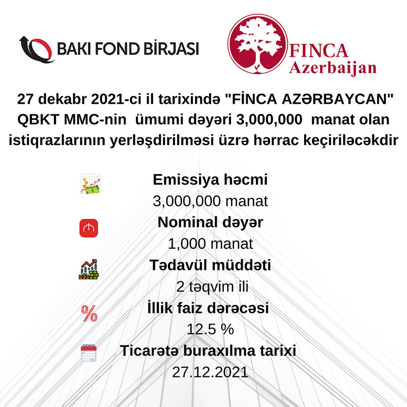 Birjanın yaydığı məlumata görə, 27 dekabr 2021-ci il tarixində "FİNCA AZƏRBAYCAN" QBKT MMC-nin istiqrazlarının yerləşdirilməsi Bakı Fond Birjasında birqiymətli hərrac üsulu ilə həyata keçiriləcəkdir.