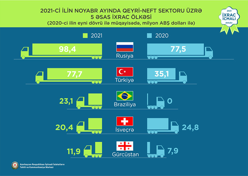 2021-ci ilin noyabr ayında qeyri-neft sektoruna aid ən çox mal ixrac edilən ölkələrin siyahısında Rusiya Federasiyası (98,4 milyon ABŞ dolları) birinciliyə yüksəlib. Bu siyahıda Türkiyə ikinci (77,7 milyon ABŞ dolları) və Braziliya üçüncü (23,1 milyon ABŞ dolları) olub.