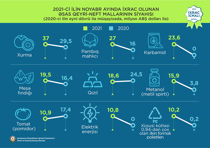2021-ci ilinnoyabr ayında ixrac edilən qeyri-neft sektoruna aid malların siyahısında xurma (37 milyon ABŞ dolları) birinci, pambıq mahlıcı (27 milyon ABŞ dolları) ikinci və karbamid (23,6 milyon ABŞ dolları) üçüncü olub.