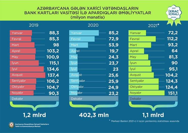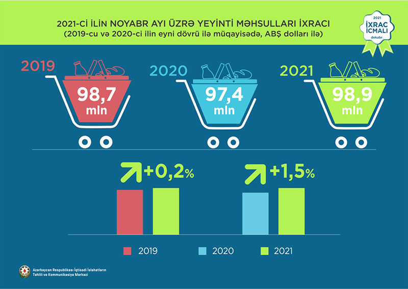 Normallaşma prosesinin davam etdiyi dövrdə noyabr ayı üzrə ixrac 2,95 mlrd ABŞ dolları təşkil edib. Qeyri-neft sektoru üzrə ixracda artım 58,7% təşkil etməklə 307,2 mln ABŞ dolları olub. 2021-ci ilin noyabr ayı ərzində yeyinti məhsulları üzrə ixrac ötən ilin müvafiq ayı ilə müqayisədə 1,6% artaraq 98,9 milyon ABŞ dolları, qeyri-yeyinti məhsulları üzrə isə 2,2 dəfə artaraq 208,3 milyon ABŞ dolları təşkil edib.