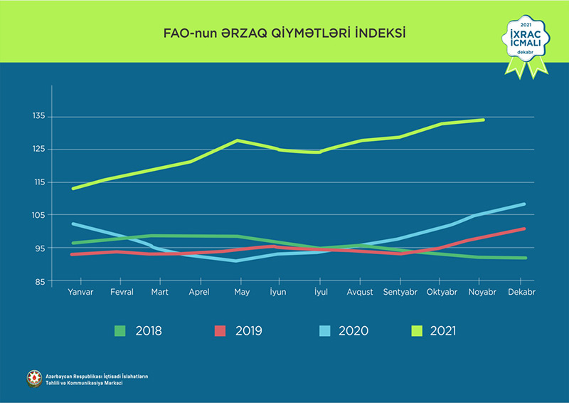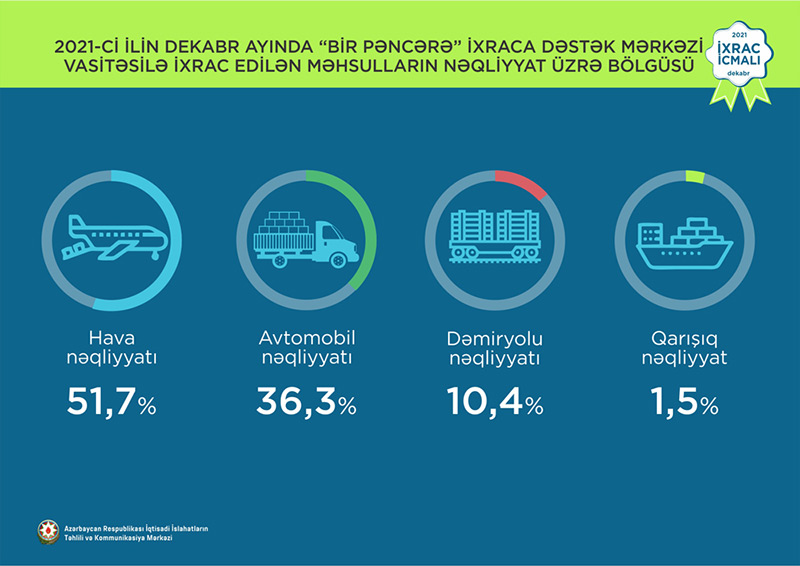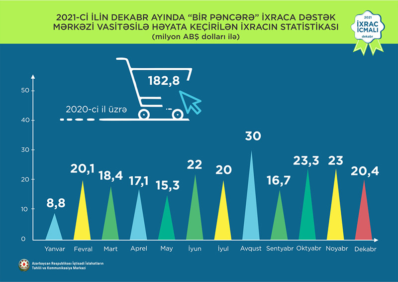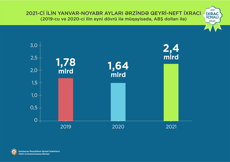 “İxrac icmalı”nın dekabr sayına əsasən, 2021-ci ilin ilk 11 ayı ərzində Azərbaycanın ixracı 19,8mlrd. ABŞ dolları, qeyri-neft sektoru üzrə 2,4 mlrd. ABŞ dolları təşkil edib. Qeyri-neft sektoru üzrə ixrac 2020-ci ilin müvafiq dövrü ilə müqayisədə 720,8 mln. ABŞ dolları və ya 44% artıb. 2021-ci ilin 11 ayı ərzində meyvə-tərəvəz məhsulları ötən ilin eyni dövrü ilə müqayisədə 258,8 min ABŞ dolları artaraq 549,8 milyon ABŞ dolları təşkil edib. Müvafiq dövr ərzində qeyri-neft ixracında pambıq iplik 3,4 dəfə, kimya sənayesi məhsulları 2,7 dəfə, qara metallar və onlardan hazırlanan məmulatlar 2,3 dəfə, pambıq lifi 70,2%, alüminium və ondan hazırlanan məmulatlar 69,3%, şəkərdə isə 29,8% artım qeydə alınıb.