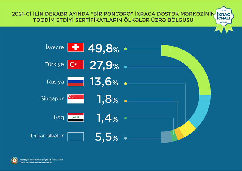 2021-ci ilin yanvar-noyabr ayları ərzində Rusiya Federasiyasına 763,8 milyon ABŞ dolları, Türkiyəyə 586,1 milyon ABŞ dolları, İsveçrə Konfederasiyasına 204,5 milyon ABŞ dolları, Gürcüstana 143,4 milyon ABŞ dolları və Braziliyaya 70,9 milyon ABŞ dolları dəyərində qeyri-neft sektoruna aid mal ixrac olunub.