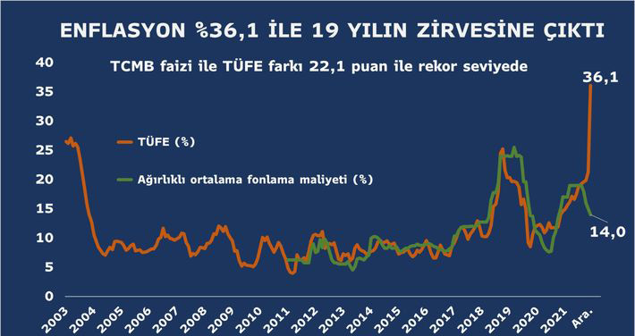 Marja xəbər veri ki, dekabrda illik inflyasiya 36,08 faiz təşkil edib (2020-ci ilin dekabr ayı ilə müqayisədə qiymətlər 36,08 faiz artıb). Bu, 2002-ci ilin sentyabrından bəri müşahidə olunan ən yüksək inflyasiyadır.