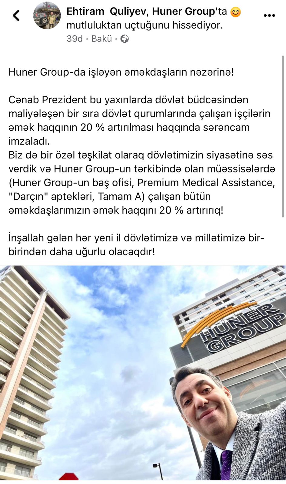 "Huner Group" şirkəti işçilərinin maaşını 20 faiz artırdı!(®) Azərbaycanda özünəməxsus idarəetmə sistemi və biznes yanaşması ilə fərqlənən Huner Group çalışanlarının əmək haqları artırılıb. Bu barədə şirkətin təsisçisi və direktoru Ehtiram Quliyev öz sosial şəbəkə hesabında paylaşım edib.