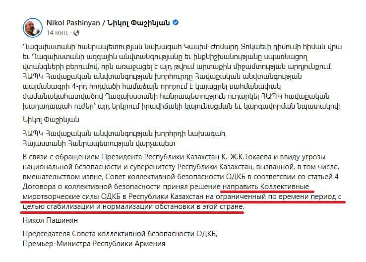 Paşinyan bildirib ki, Qazaxıstan Prezidenti Kasım-Jomart Tokayevin müraciəti ilə əlaqədar, habelə Qazaxıstanın milli təhlükəsizliyinə və suverenliyinə, o cümlədən, kənar müdaxilə nəticəsində yaranmış təhlükəni nəzərə alaraq, KTMT Şurası müvafiq müqavilənin 4-cü maddəsinə uyğun olaraq, bu ölkədə vəziyyəti sabitləşdirmək və normallaşdırmaq üçün təşkilatın sülhməramlı qüvvələrinin məhdud müddətə Qazaxıstan Respublikasına göndərilməsi barədə qərar qəbul edib.