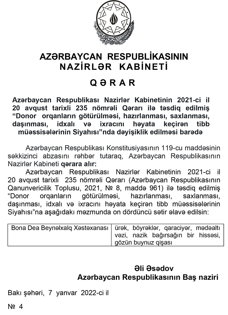 Baş nazirin imzaladığı digər qərarla isə “Donor orqanların transplantasiyasını həyata keçirən ixtisaslaşdırılmış tibb müəssisələrinin Siyahısı”na dəyişiklik edilib. Belə ki, Bona Dea Beynəlxalq Xəstəxanası donor orqanların transplantasiyasını həyata keçirən ixtisaslaşdırılmış tibb müəssisələrinin siyahısına daxil edilib.