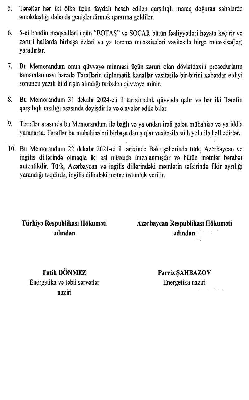 Türkiyə-Azərbaycan qaz anlaşma memorandumu təsdiq edilib, Azərbaycandan alınan 1,7 milyard kubmetr qaz "SOCAR Petrokimya" tərəfindən alınacaq.Dekabrda Türkiyə ilə Azərbaycan arasında imzalanmış təbii qazın tədarükünə dair anlaşma memorandumu Türkiyə Prezident tərəfindən təsdiq edilib.
