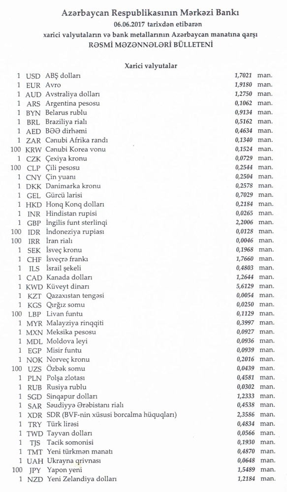 İyunun 5-də rəsmi olaraq 1 dollar 1,7021 manata, 1 avro isə 1.9177 manata bərabər idi.