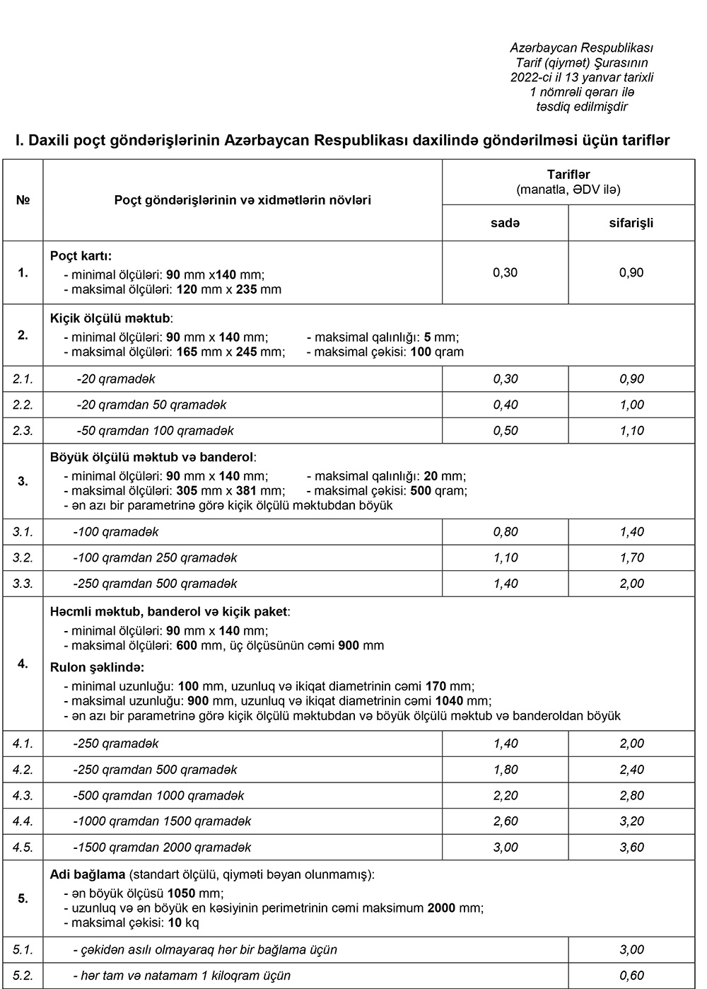 Tarif (qiymət) Şurası üzvlərinin yekdil qərarı ilə universal poçt rabitəsi xidmətindən istifadə tarifləri təsdiq edilmişdir.