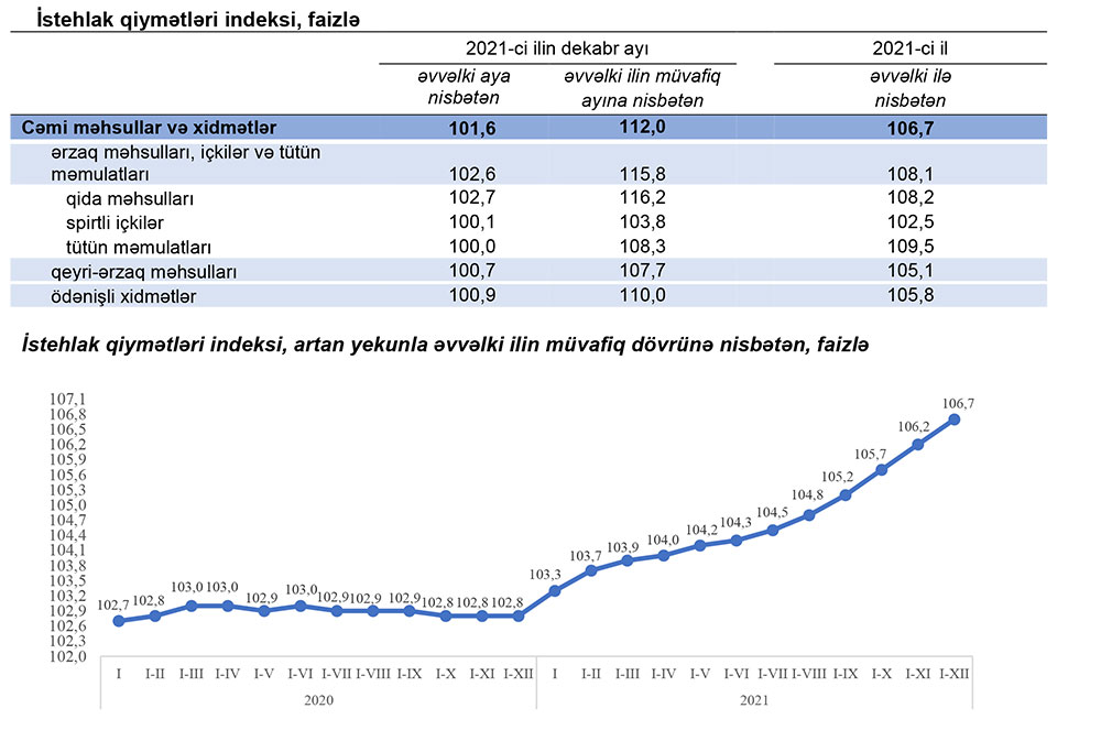Dövlət Statistika Komitəsinin yaydığı məlumata görə, 2021-ci ilin dekabr ayında istehlak qiymətləri indeksi əvvəlki aya nisbətən 1,6 faiz, 2020-ci ilin dekabr ayına nisbətən 12 faiz yüksəlib.