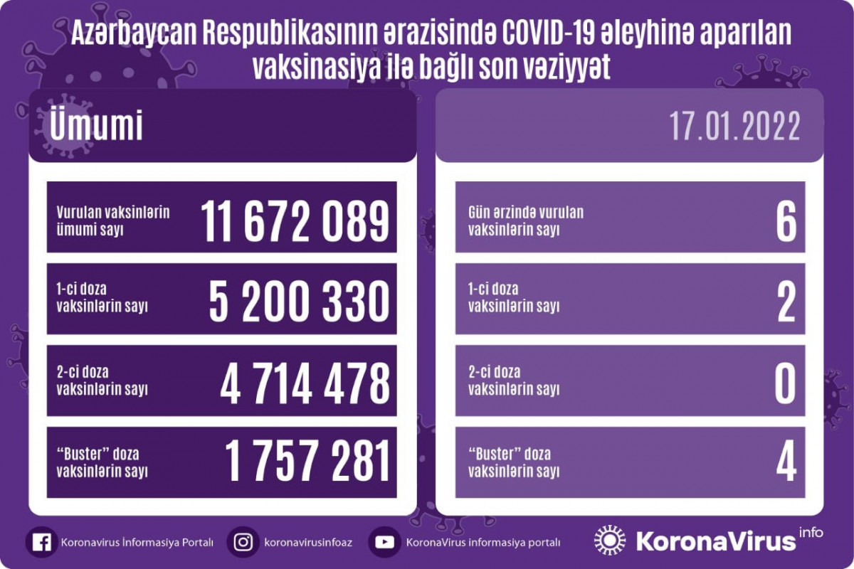 Azərbaycanda son sutkada koronavirus (COVID-19) əleyhinə 6 vaksin vurulub. Bir gündə birinci mərhələ üzrə vaksinasiya olunanların sayı 2 nəfərdir.