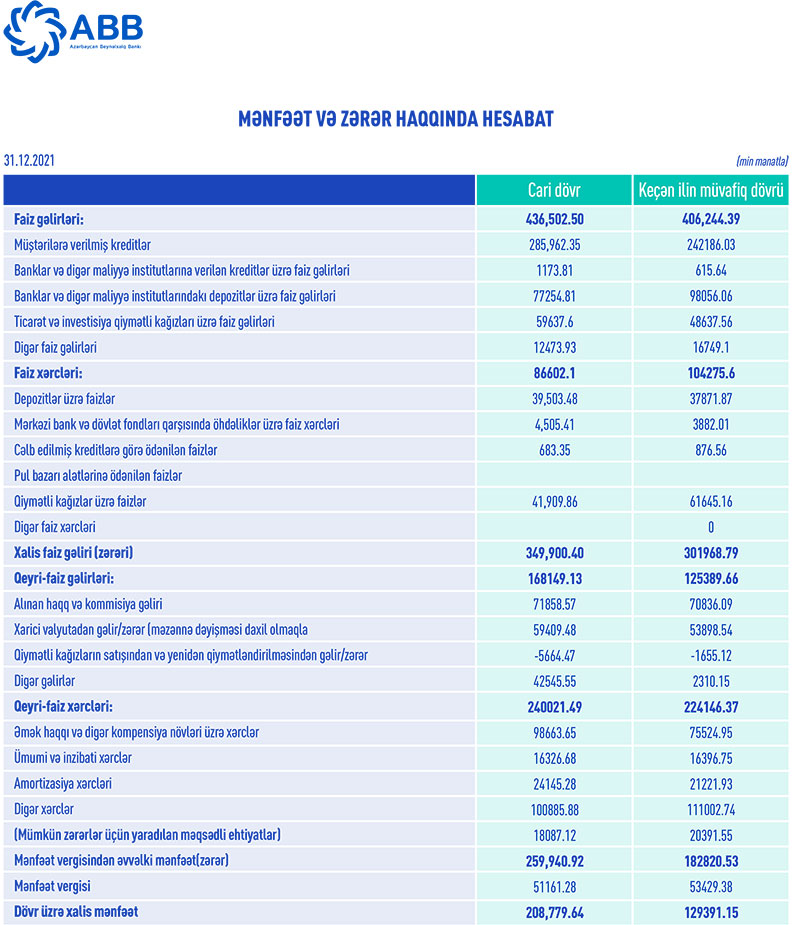 2021-ci ildə ABB 278 milyon 28 min manat əməliyyat mənfəətindən 18 milyon 87 min manat mümkün zərərlər üçün yaradılan məqsədli ehtiyatlara ayırıb və 51 milyon 161 min manat mənfəət vergisi hesablayıb. Nəticədə, Bank 2021-ci ili 208 milyon 780 min manat xalis mənfəətlə bağlayıb. Müqayisə üçün qeyd edək ki, 2020-ci ildə ABB 203 milyon 212 min manat əməliyyat mənfəətindən 20 milyon 391 min manat mümkün zərərlər üçün yaradılan məqsədli ehtiyatlara ayırmış, 53 milyon 429 min manat mənfəət vergisi ödəmişdi.