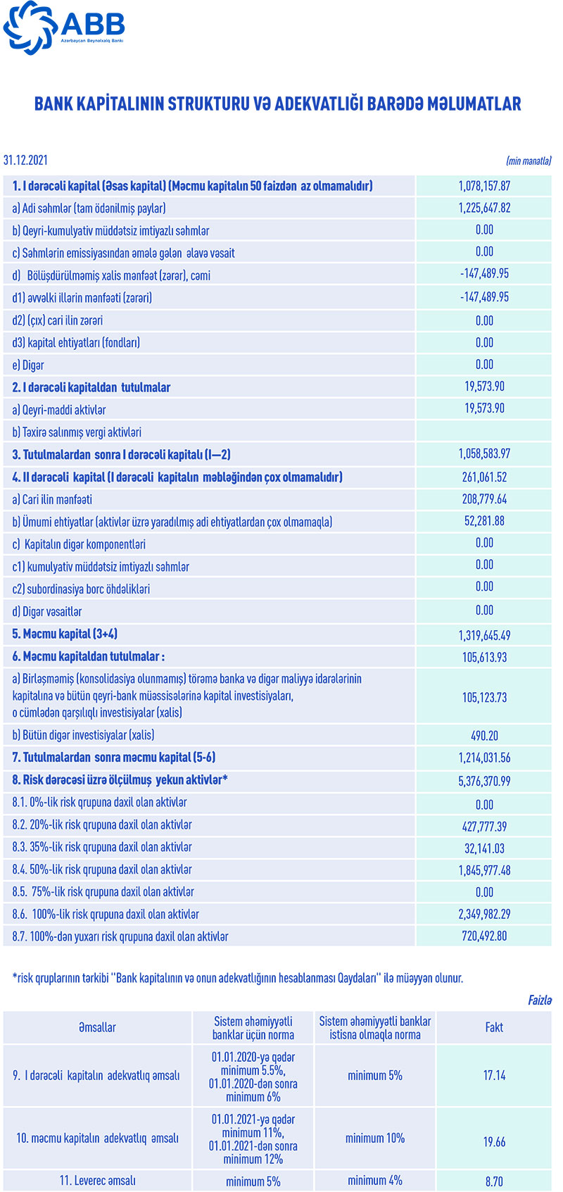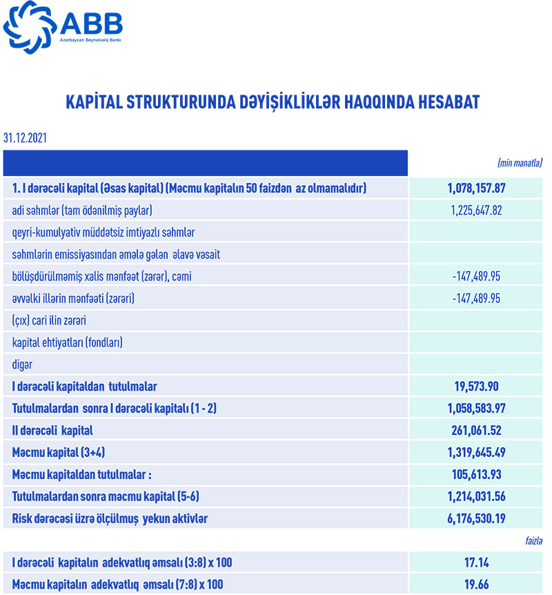31 dekabr 2021-ci il tarixində “ABB” ASC 1 milyard 214 milyon 32 min manat məcmu kapitala malik olub. Bank 31 dekabr 2020-ci il tarixində 1 milyard 112 milyon 195 min manat məcmu kapitala malik idi.