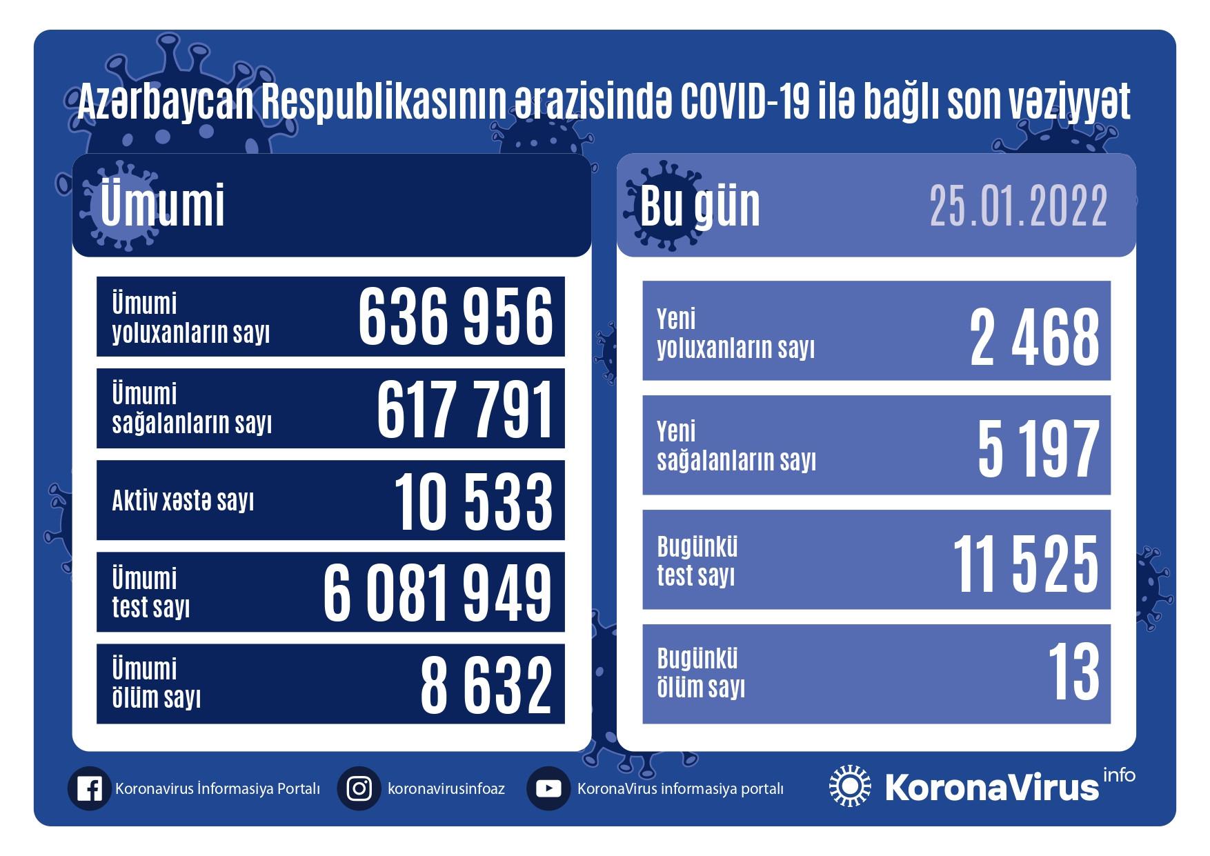 Azərbaycan Respublikasında koronavirus (COVID-19) infeksiyasına 2468 yeni yoluxma faktı qeydə alınıb, 5 197 nəfər müalicə olunaraq sağalıb.