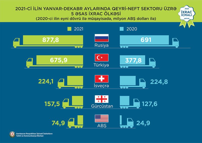 2021-ci ilin yanvar-dekabr ayları ərzində Rusiya Federasiyasına 877,8 milyon ABŞ dolları, Türkiyəyə 675,9 milyon ABŞ dolları, İsveçrə Konfederasiyasına 224,1 milyon ABŞ dolları, Gürcüstana 157,5 milyon ABŞ dolları və Amerika Birləşmiş Ştatlarına isə 74,9 milyon ABŞ dolları dəyərində qeyri-neft sektoruna aid mal ixrac olunub.