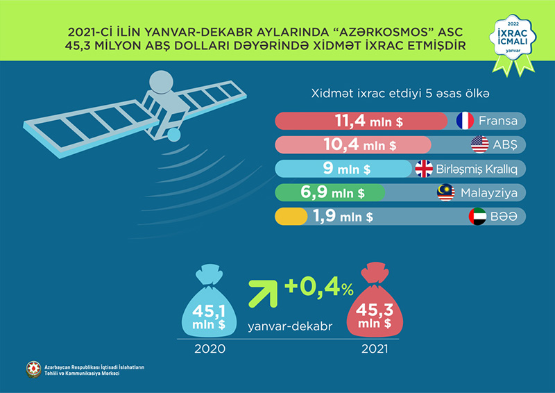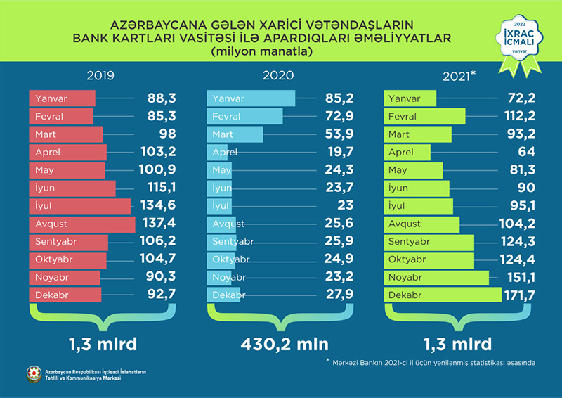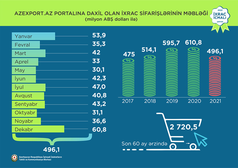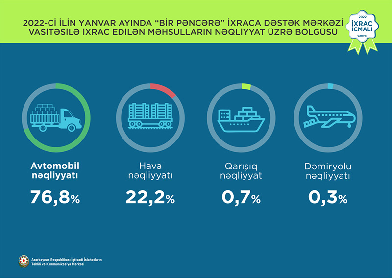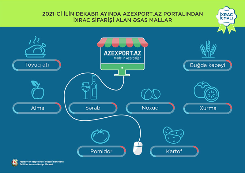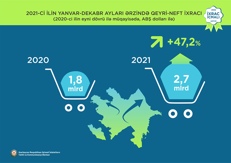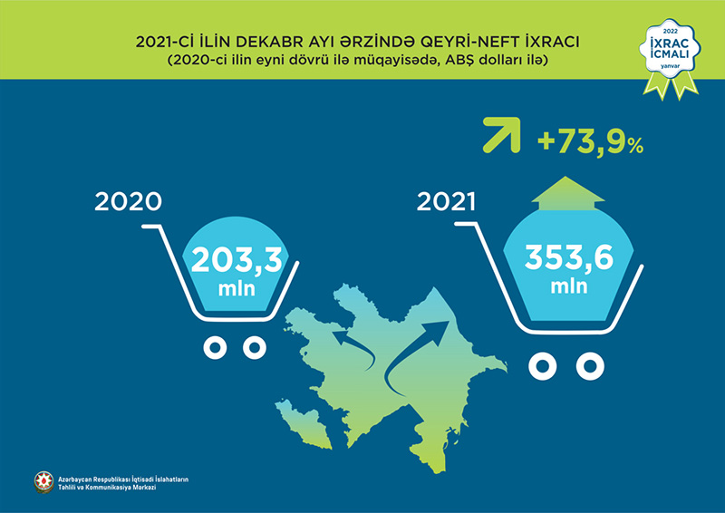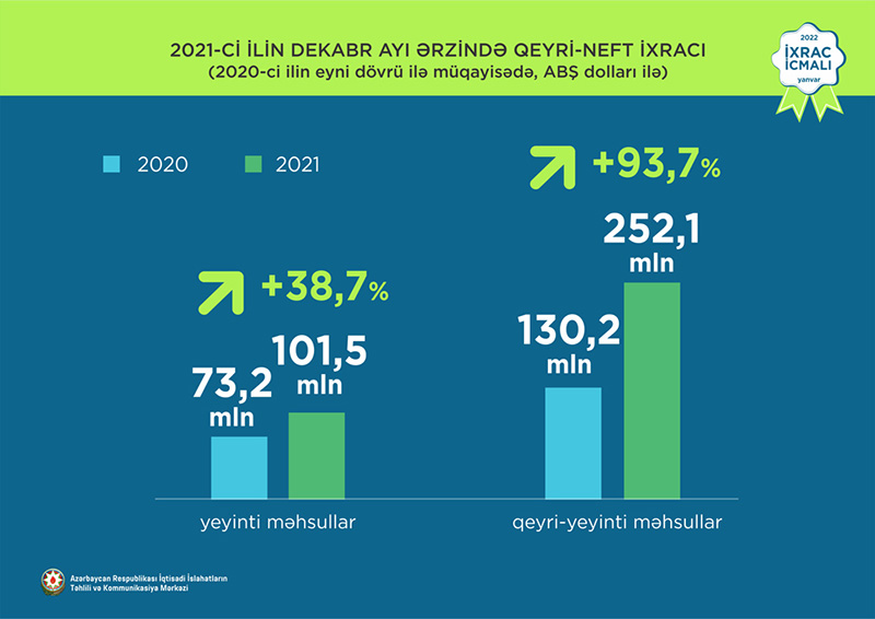 Normallaşma prosesinin davam etdiyi dövrdə dekabr ayı üzrə ixrac 2,4 mlrd ABŞ dolları təşkil edib. Qeyri-neft sektoru üzrə ixracda artım 73,9% təşkil etməklə 353,6 mln ABŞ dolları olub. 2021-ci ilin dekabr ayı ərzində yeyinti məhsulları üzrə ixrac ötən ilin müvafiq ayı ilə müqayisədə 38,7% artaraq 101,5 milyon ABŞ dolları, qeyri-yeyinti məhsulları üzrə isə 93,7% artaraq 252,1 milyon ABŞ dolları təşkil edib.