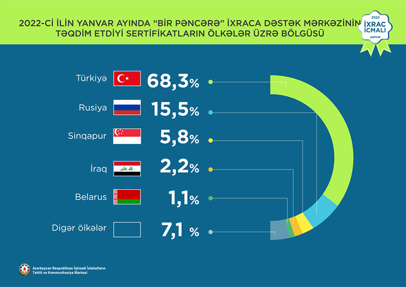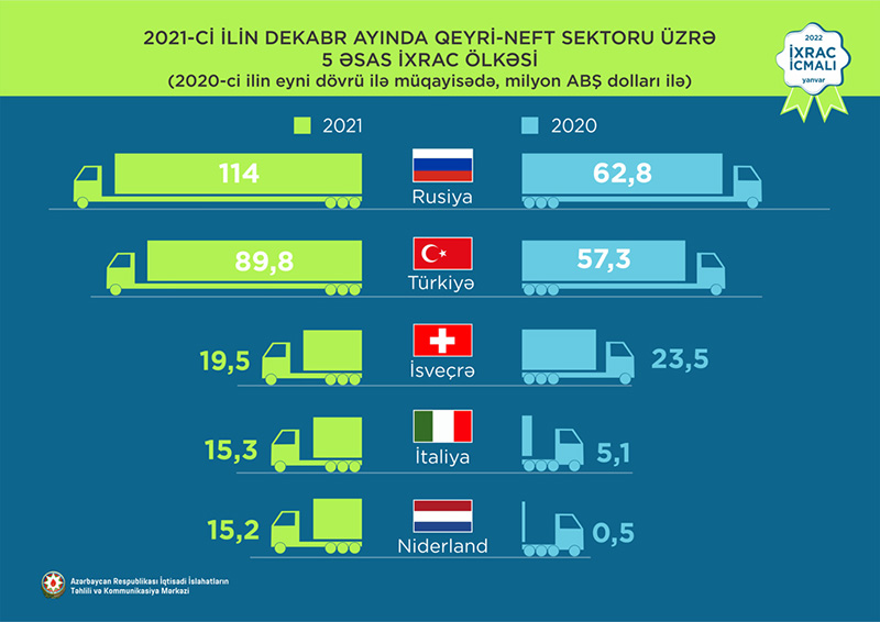 2021-ci ilin dekabr ayında qeyri-neft sektoruna aid ən çox mal ixrac edilən ölkələrin siyahısında Rusiya Federasiyası (114 milyon ABŞ dolları) birinciliyə yüksəlib. Bu siyahıda Türkiyə ikinci (89,8 milyon ABŞ dolları) və İsveçrə üçüncü (19,5 milyon ABŞ dolları) olub.