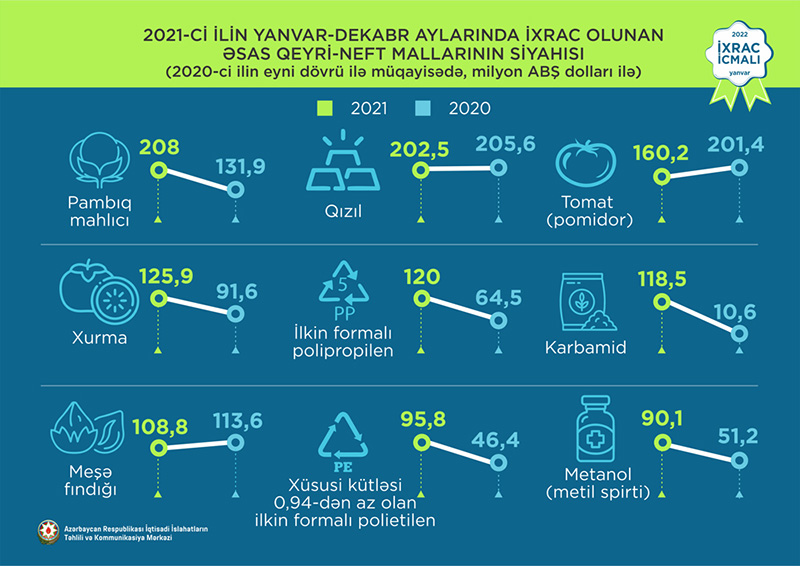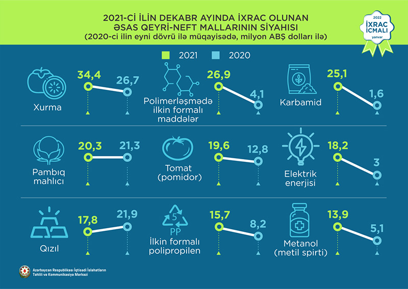 2021-ci ilin dekabr ayında ixrac edilən qeyri-neft sektoruna aid malların siyahısında xurma (34,4 milyon ABŞ dolları) birinci, polimerləşmə nəticəsində əmələ gələn ilkin formalı digər maddələr (26,9 milyon ABŞ dolları) ikinci və karbamid (25,1 milyon ABŞ dolları) üçüncü olub.